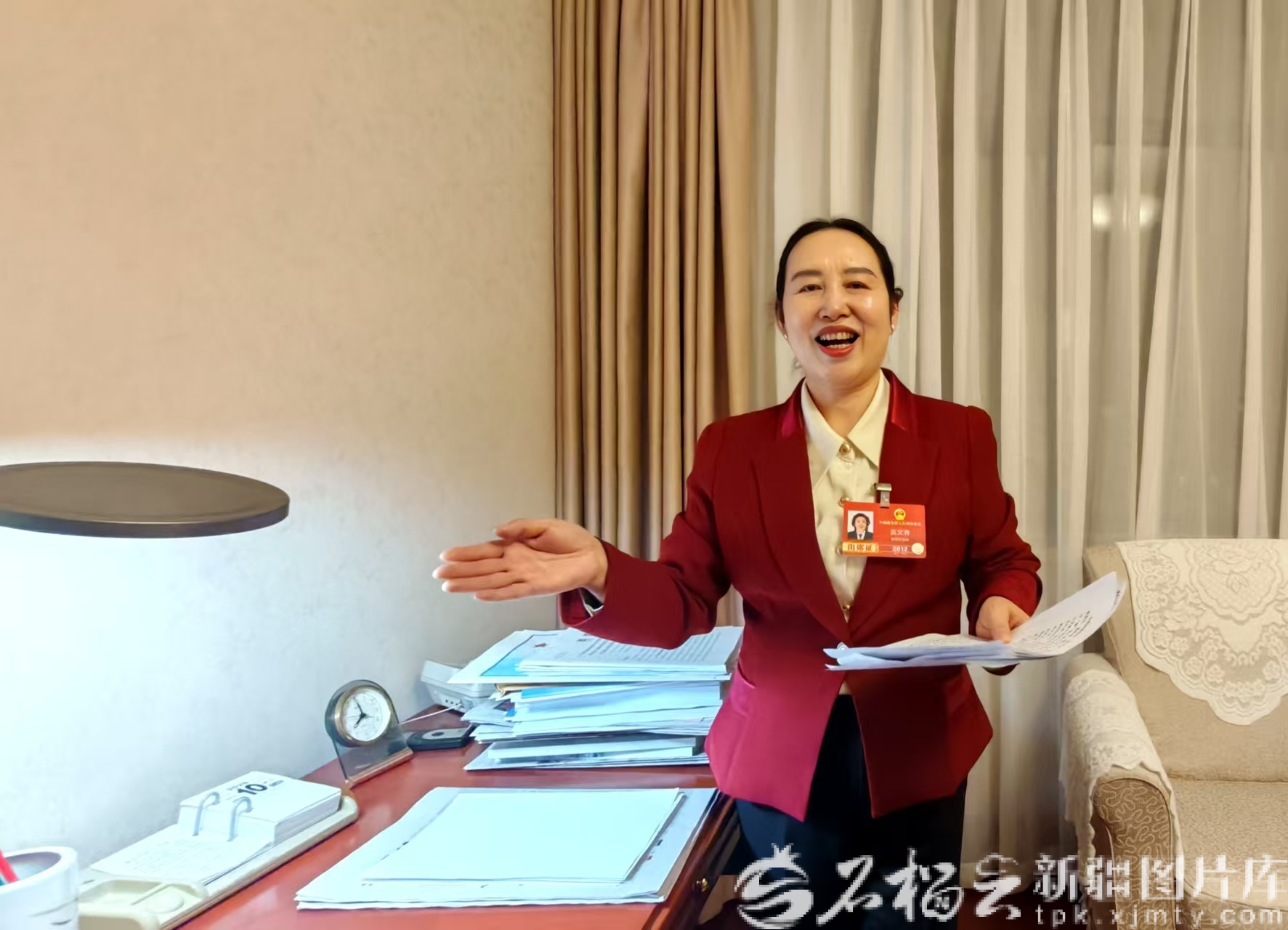 3月10日晚,全國(guó)人大代表吳文秀向記者講述當(dāng)日上午發(fā)言時(shí)的心情。天山網(wǎng)-新疆日?qǐng)?bào)記者王娜 攝