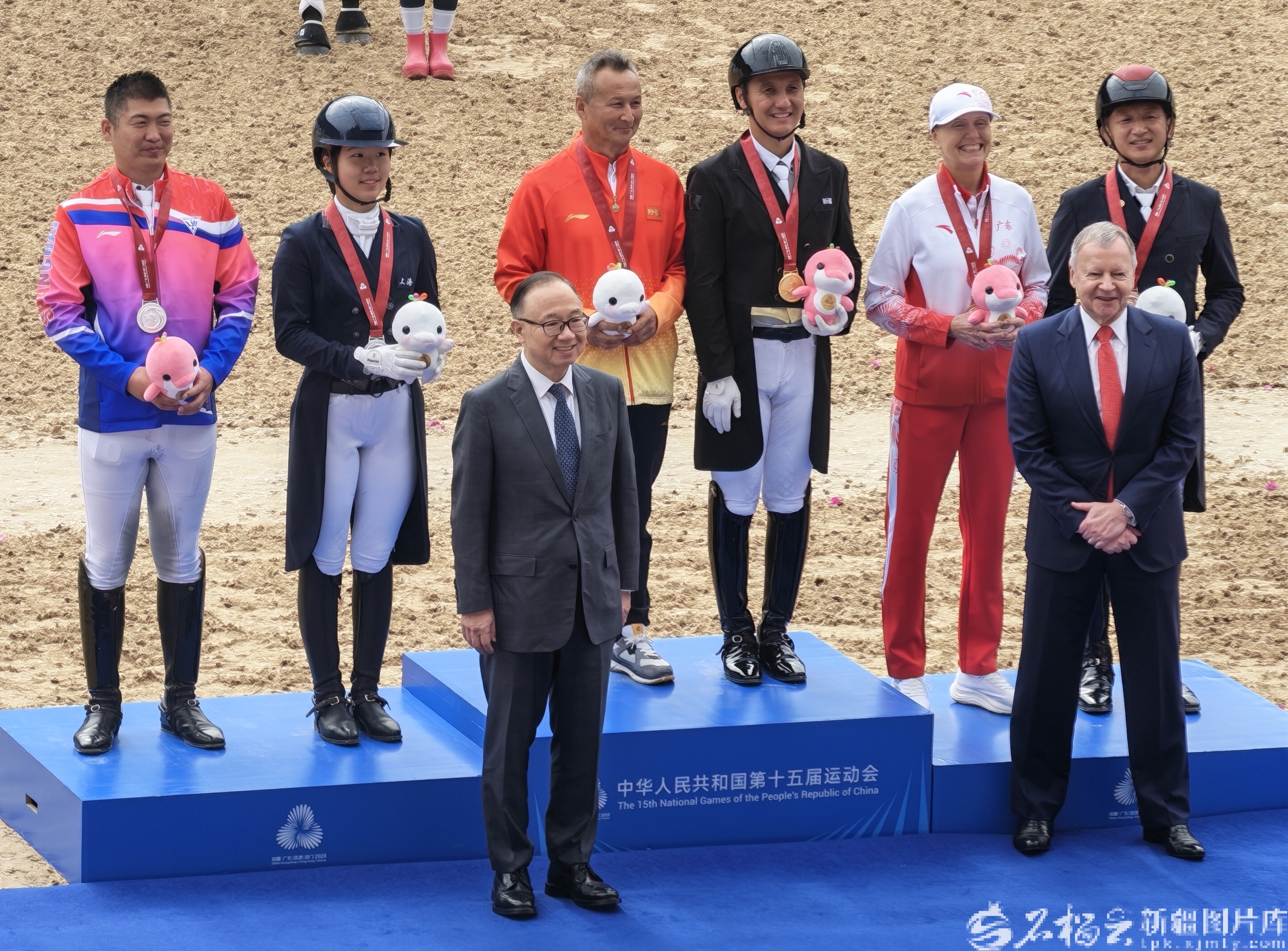 11月12日,在廣東省深圳市光明國際馬術中心,第十五屆全國運動會馬術盛裝舞步個人賽頒獎儀式現(xiàn)場。