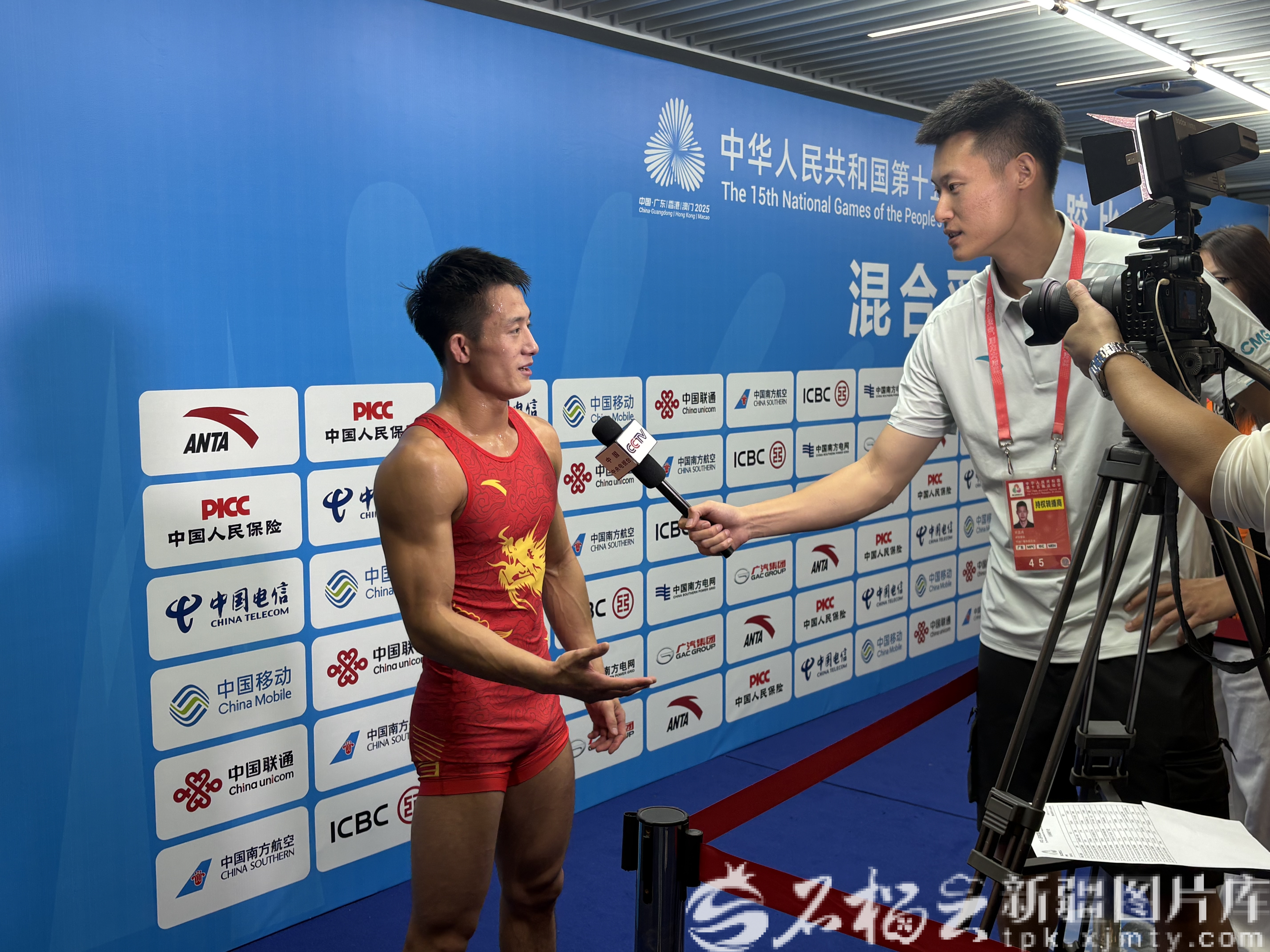 廣東清遠,第十五屆全國運動會摔跤賽場的混合采訪區(qū),運動員正在接受記者采訪。天山網(wǎng)-新疆日報記者 王晶晶 攝