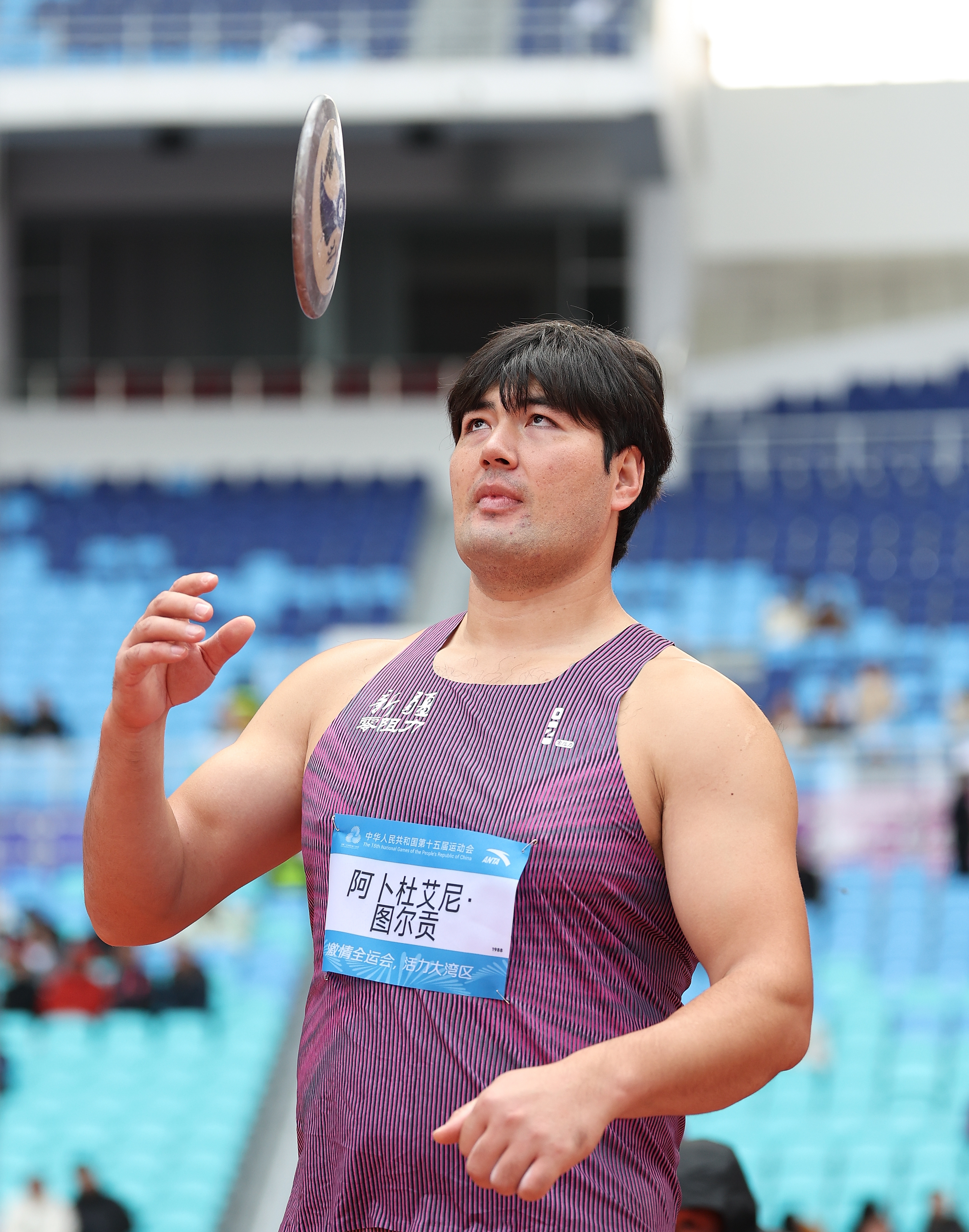 在第十五屆全運會男子鐵餅項目賽場上,新疆運動員阿卜杜艾尼·圖爾貢正在比賽中。第十五屆全運會官網(wǎng)