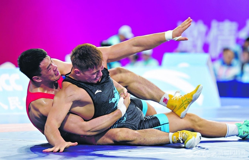 11月13日,第十五屆全國(guó)運(yùn)動(dòng)會(huì)摔跤男子古典式97公斤級(jí)決賽中,新疆隊(duì)選手阿力木拉提·達(dá)拉吾拜(右)獲得銀牌。
