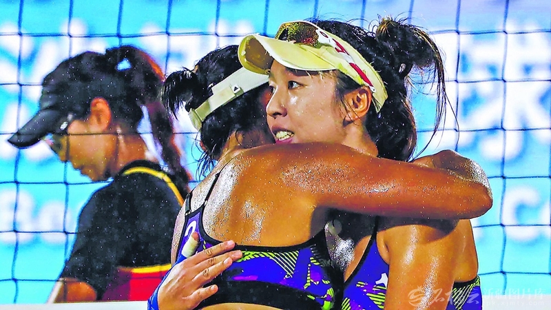 11月6日,第十五屆全國(guó)運(yùn)動(dòng)會(huì)香港維多利亞公園沙灘排球比賽現(xiàn)場(chǎng),新疆隊(duì)選手王婧哲(右)與夏欣怡相擁鼓勵(lì)。