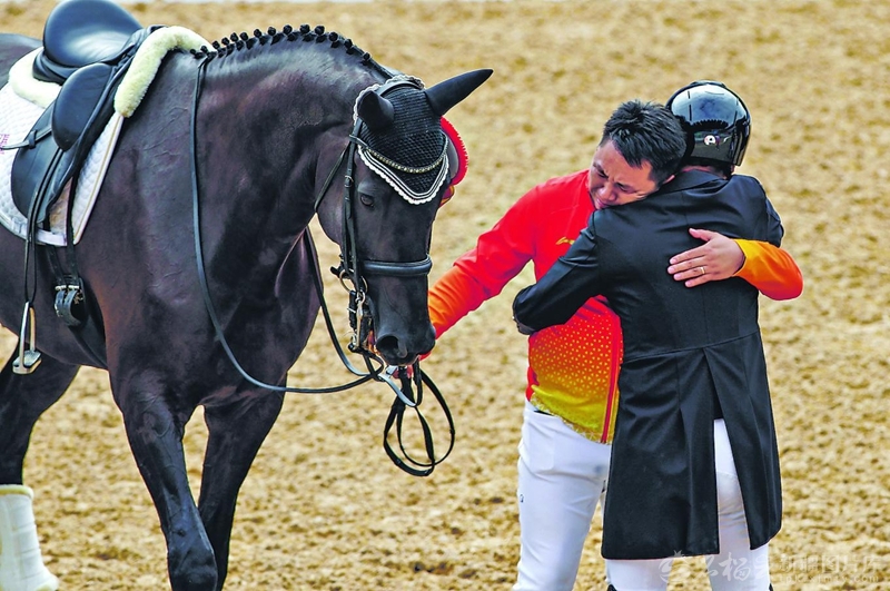11月12日,第十五屆全國(guó)運(yùn)動(dòng)會(huì)深圳光明國(guó)際馬術(shù)中心,新疆隊(duì)選手劉濤(右)奪冠后和隊(duì)友緊緊擁抱在一起。