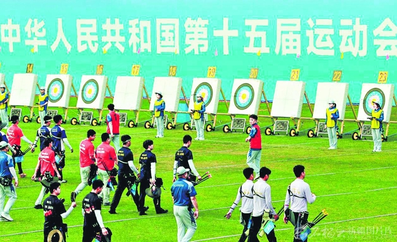 11月15日,第十五屆全國(guó)運(yùn)動(dòng)會(huì)射箭比賽現(xiàn)場(chǎng),運(yùn)動(dòng)員走向靶位查看成績(jī)。