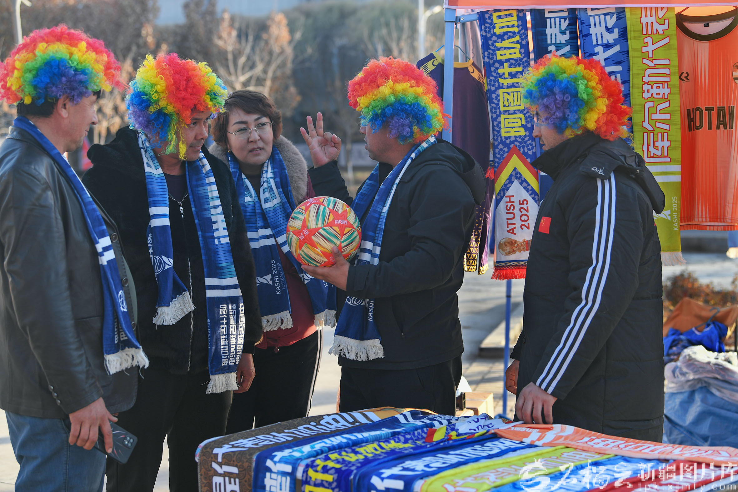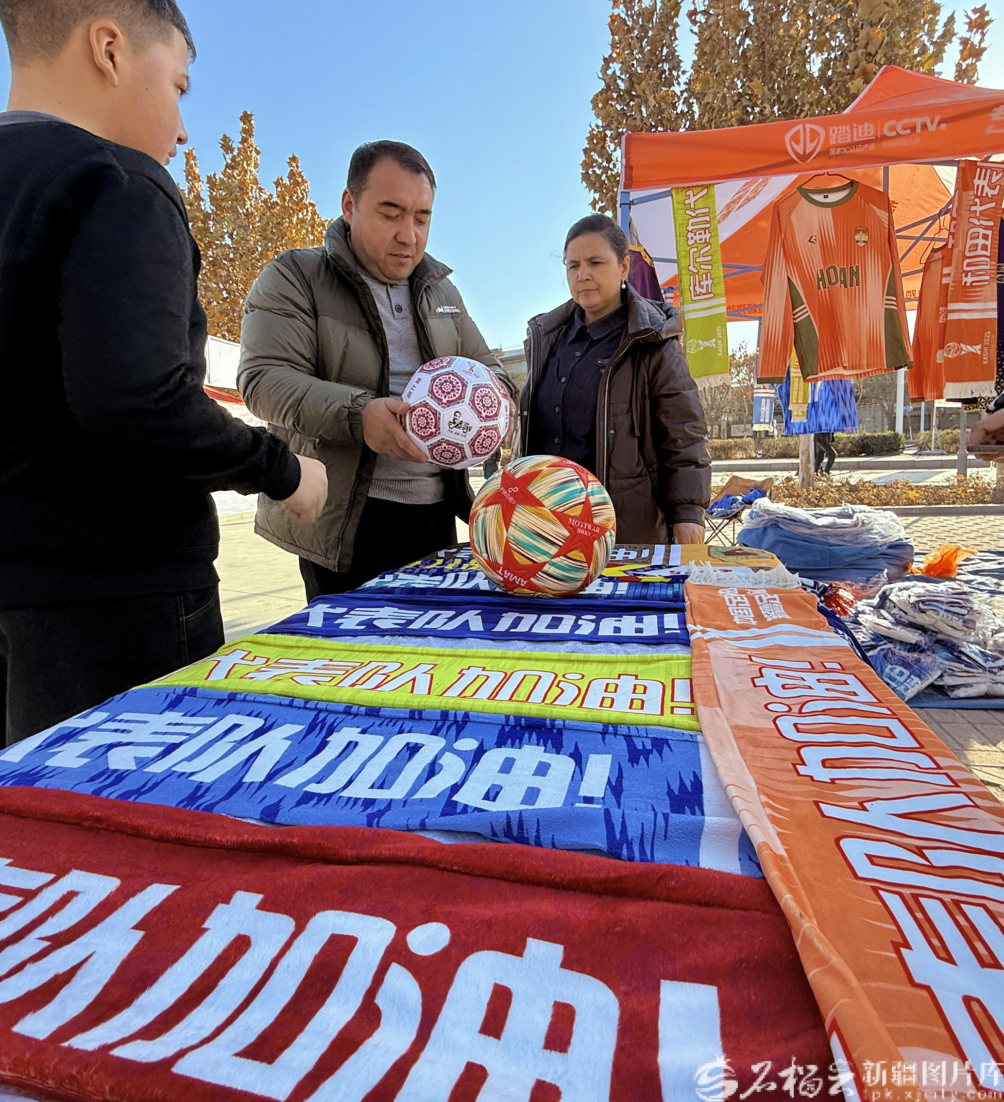 12月5日,球迷在“喀什杯”足球超級邀請賽現(xiàn)場選購足球主題文創(chuàng)品。