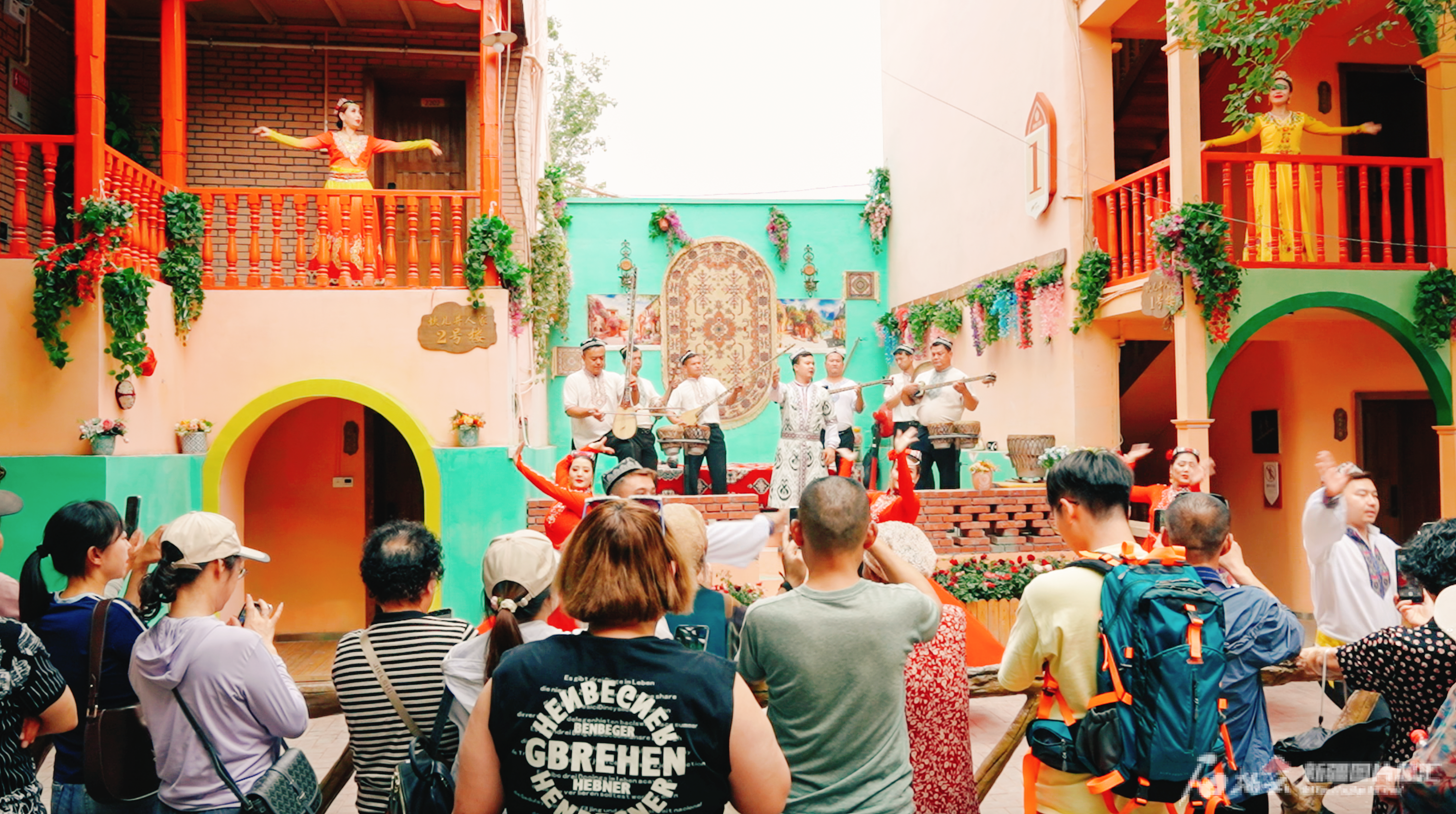 假日里,坎兒井民俗園迎賓廣場(chǎng)懸掛著紅旗、燈籠,滿眼都是喜慶的氛圍。5日,這里為游客準(zhǔn)備了沉浸式體驗(yàn)活動(dòng),景區(qū)工作人員扮演的“村長(zhǎng)”向游客們發(fā)出邀請(qǐng),“今天是個(gè)好日子,村里的坎兒井通水啦!大家快跟著我們的村民一起去看看?!庇慰蛡兩碇皡^(qū)免費(fèi)提供的艾德萊斯袷袢、長(zhǎng)裙,跟隨喜悅的“村民”們一起前往慶典廣場(chǎng),跳起歡快的舞蹈,隨后又在講解員的帶領(lǐng)下參觀坎兒井。該景區(qū)還推出“國(guó)慶盛景 坎兒井之約”主題活動(dòng),邀請(qǐng)來自全國(guó)各地的游客通過繪畫、寫留言等形式,為祖國(guó)送上祝福。豐富的活動(dòng)也延長(zhǎng)了游客在景區(qū)的停留時(shí)間。