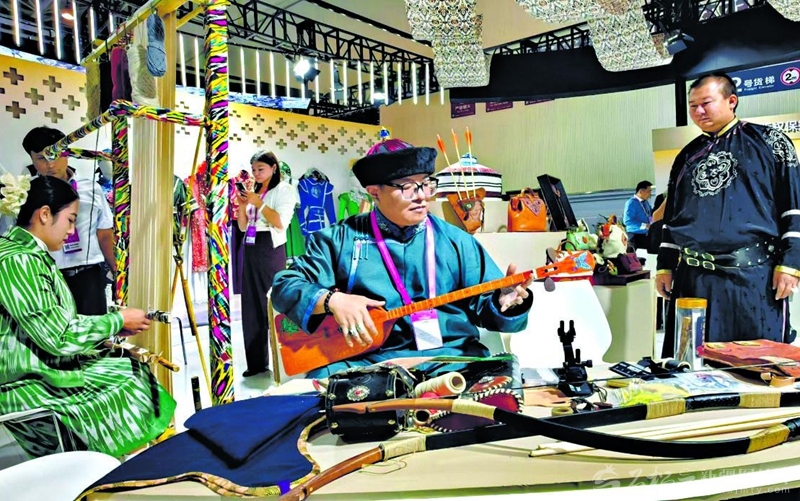 入選全國民間文藝版權(quán)保護(hù)與促進(jìn)試點(diǎn)地區(qū)的察布查爾錫伯自治縣展臺上,陳列著創(chuàng)刊于1946年的《察布查爾報(bào)》新舊合訂本原件——這是我國乃至全球唯一的錫伯文報(bào)紙。從紙張泛黃的黑白印刷到套色彩印報(bào)紙,豎排版的錫伯文不僅記錄著錫伯族的歷史變遷,更見證了錫伯族文化在中華文化大家庭里共生共榮的歷程。展區(qū)內(nèi),國家通用語言文字與錫伯文對照書寫的《中國夢》《中華一家親》書法作品格外引人注目,工作人員徐明向觀眾介紹:“錫伯文書法深受中原文化影響,那邊是錫伯文隸書,這邊是錫伯文楷書?!?/p>