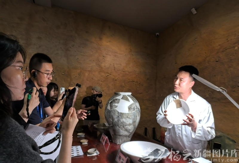 劉瀟(右一)向媒體記者介紹文物修復(fù)流程。受訪者供圖