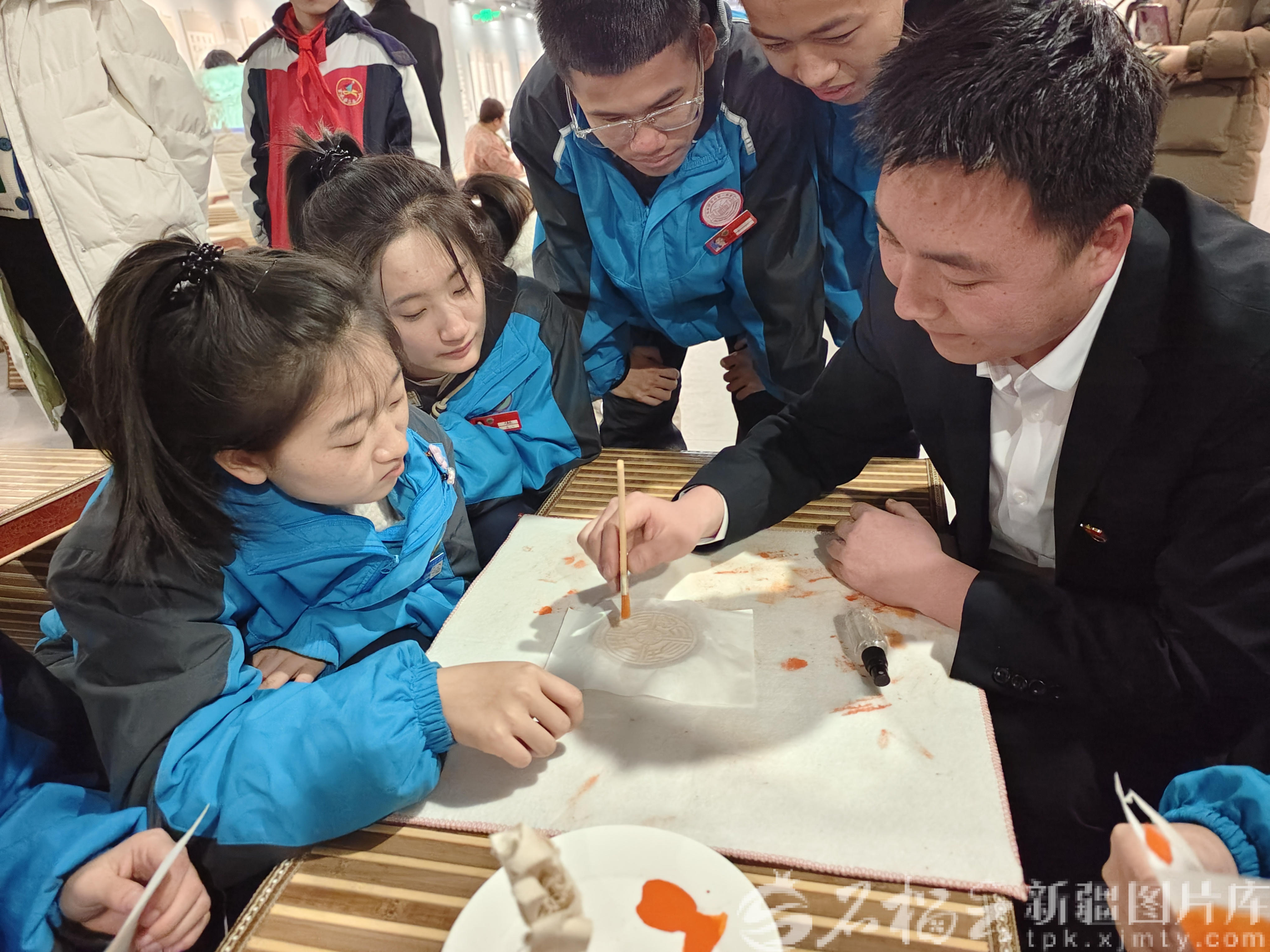 劉瀟(右一)向?qū)W生講解文物知識。受訪者供圖