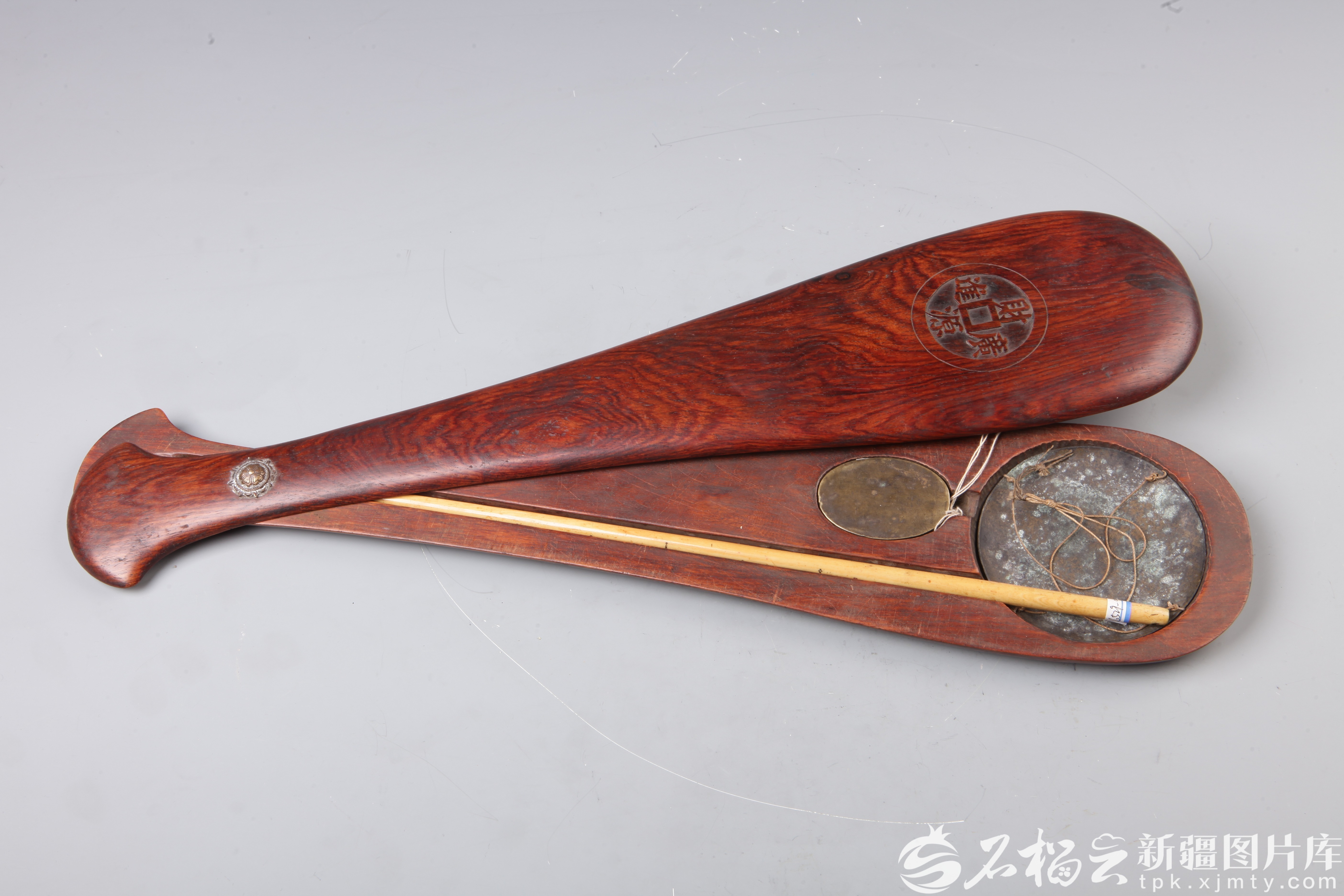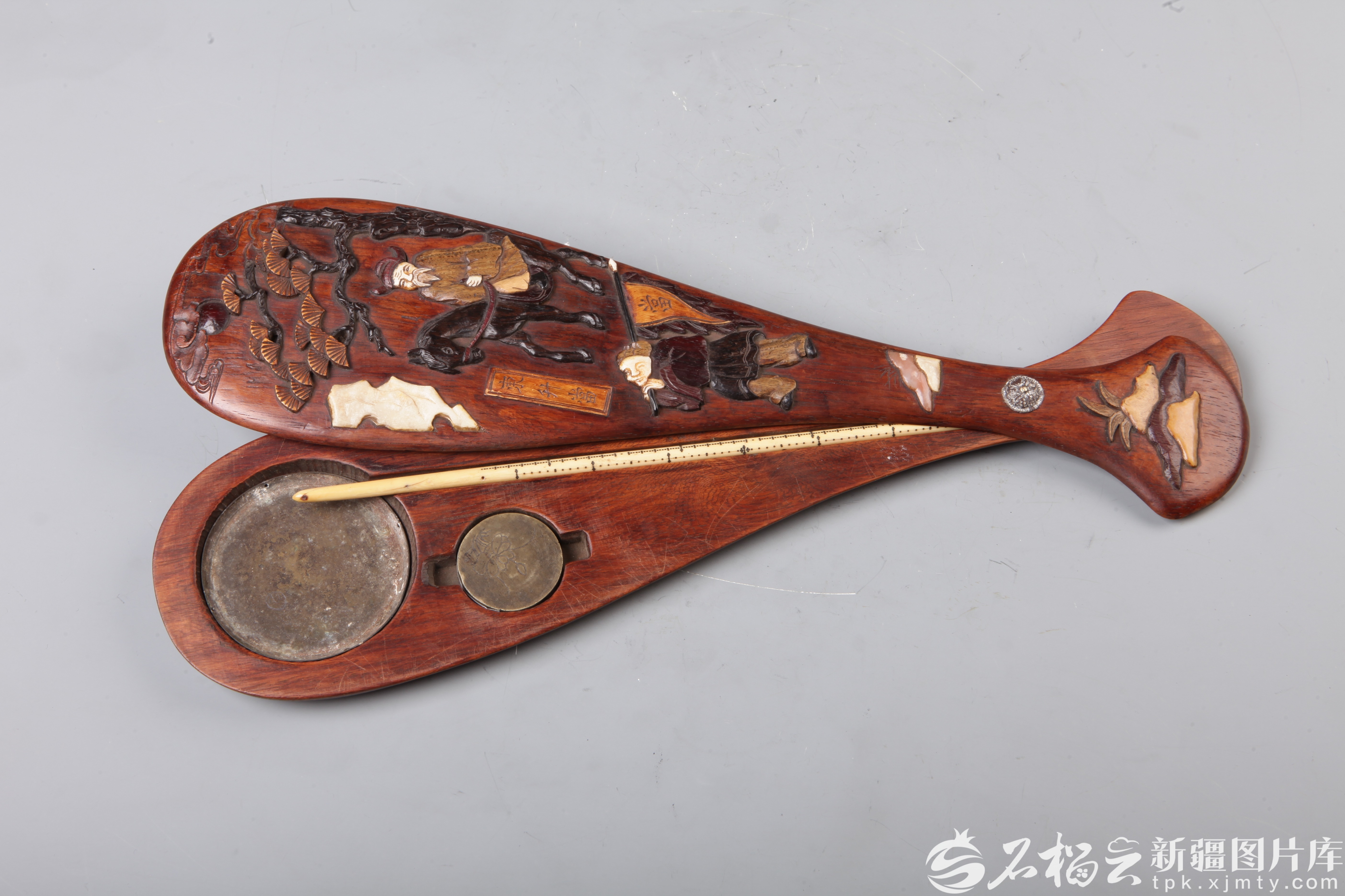 阿克蘇地區(qū)博物館收藏的清代黃花梨戥子,上面用百寶嵌工藝鑲嵌著“馬上發(fā)財”吉祥圖案和“東升當”字樣。吳文強供圖
