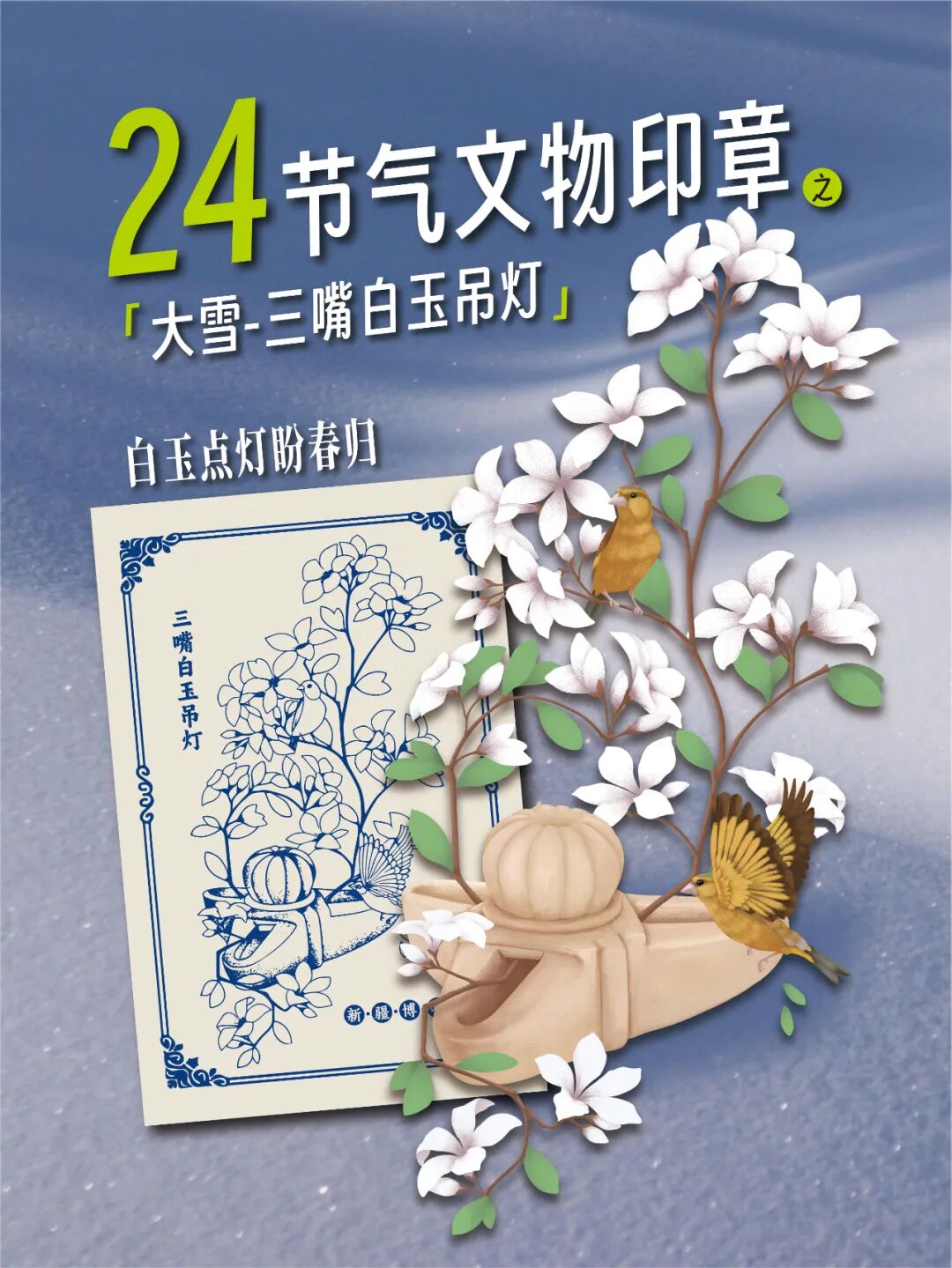 “大雪”主題印章創(chuàng)作原型三嘴白玉吊燈是宋代照明器具,通體由溫潤玉料雕琢而成,獨特的三嘴造型專為盛放油料設(shè)計,千年前曾在無數(shù)深冬寒夜中為古人點亮案頭暖光。在印章章面的雕琢上,匠人不僅精細復(fù)刻了燈盞的圓潤肌理,還巧妙融入棲枝雀鳥、白色花飾等冬日意象,雀鳥依偎燈側(cè)、白花纏繞燈身,每一道印紋都如時光的褶皺,仿佛能讓使用者觸摸到千年前玉料的溫涼,以及燈焰殘存的脈脈余溫。