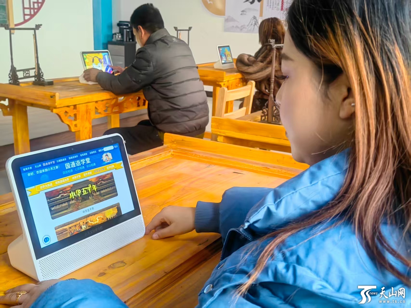 12月16日,在莎車縣米夏鎮(zhèn)托尕其3村村委會(huì)綜合活動(dòng)中心,村民正在使用小天中華文化學(xué)習(xí)機(jī)學(xué)習(xí)。天山網(wǎng)記者崔導(dǎo)勝 攝