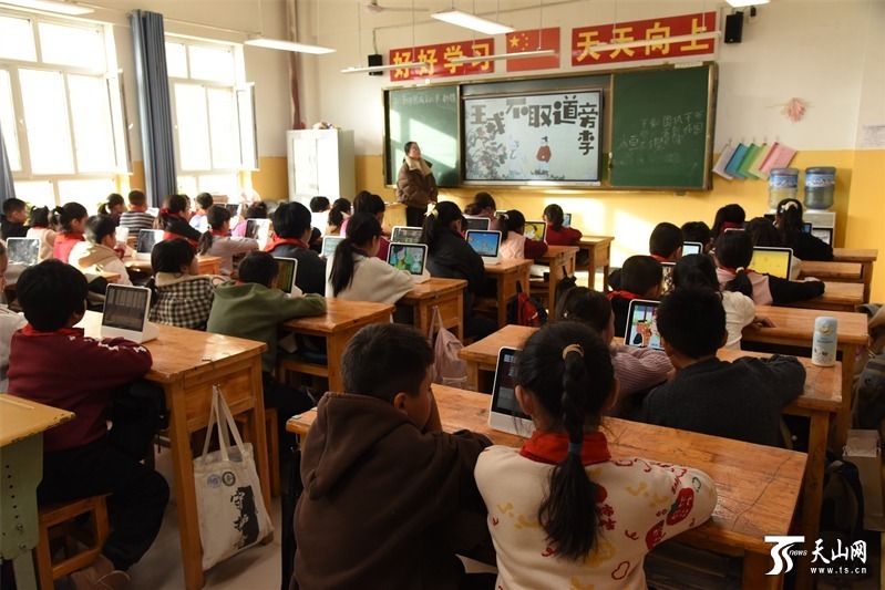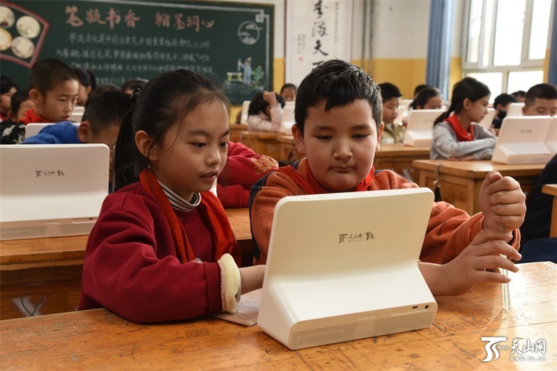 12月17日,莎車縣第三小學(xué)四年級(jí)三班的學(xué)生正在體驗(yàn)小天中華文化學(xué)習(xí)機(jī)上的海量學(xué)習(xí)資源。記者崔導(dǎo)勝 攝