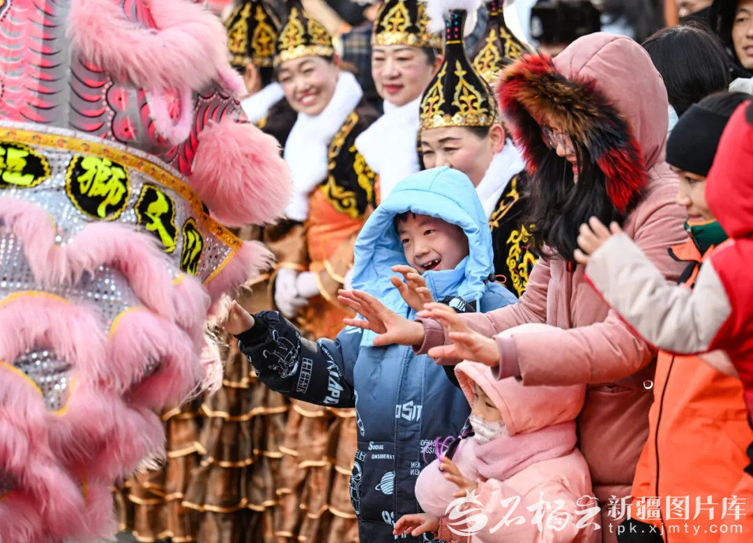1月1日,在大巴扎步行街,舞獅與小朋友們熱情互動(dòng)。米熱扎提·木塔力甫攝
