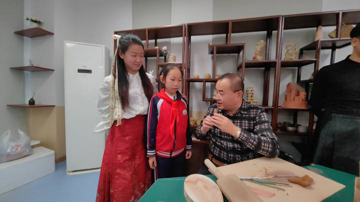 李鋒向?qū)W生講解紫砂古塤制作流程。資料圖