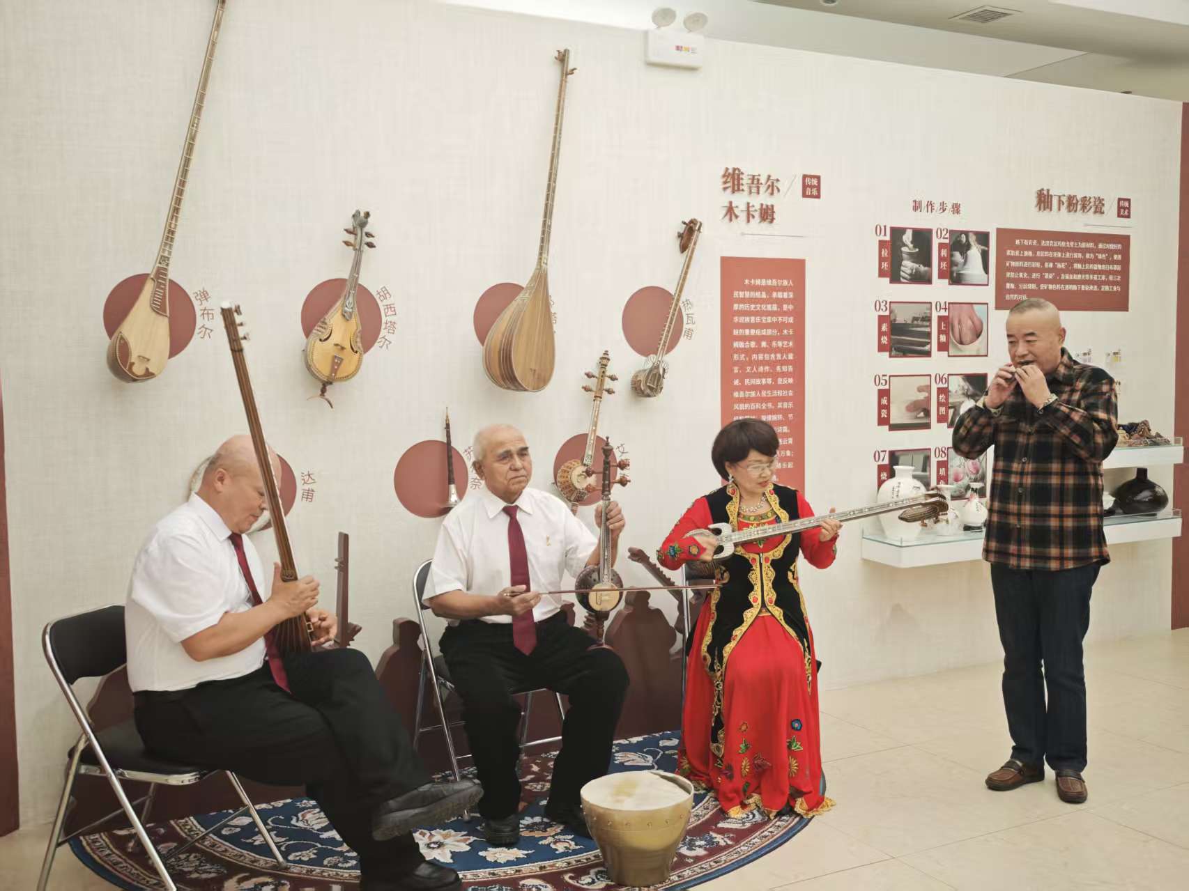 李鋒(右一)在克拉瑪依市文化館向演奏紫砂哨塤。資料圖