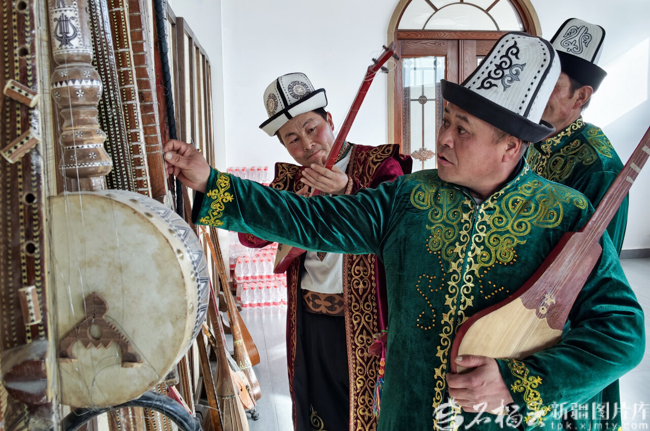 1月15日,溫宿縣博孜墩柯爾克孜族鄉(xiāng)阿克布拉克村游客服務(wù)中心,民間藝人在演出前選擇樂(lè)器。