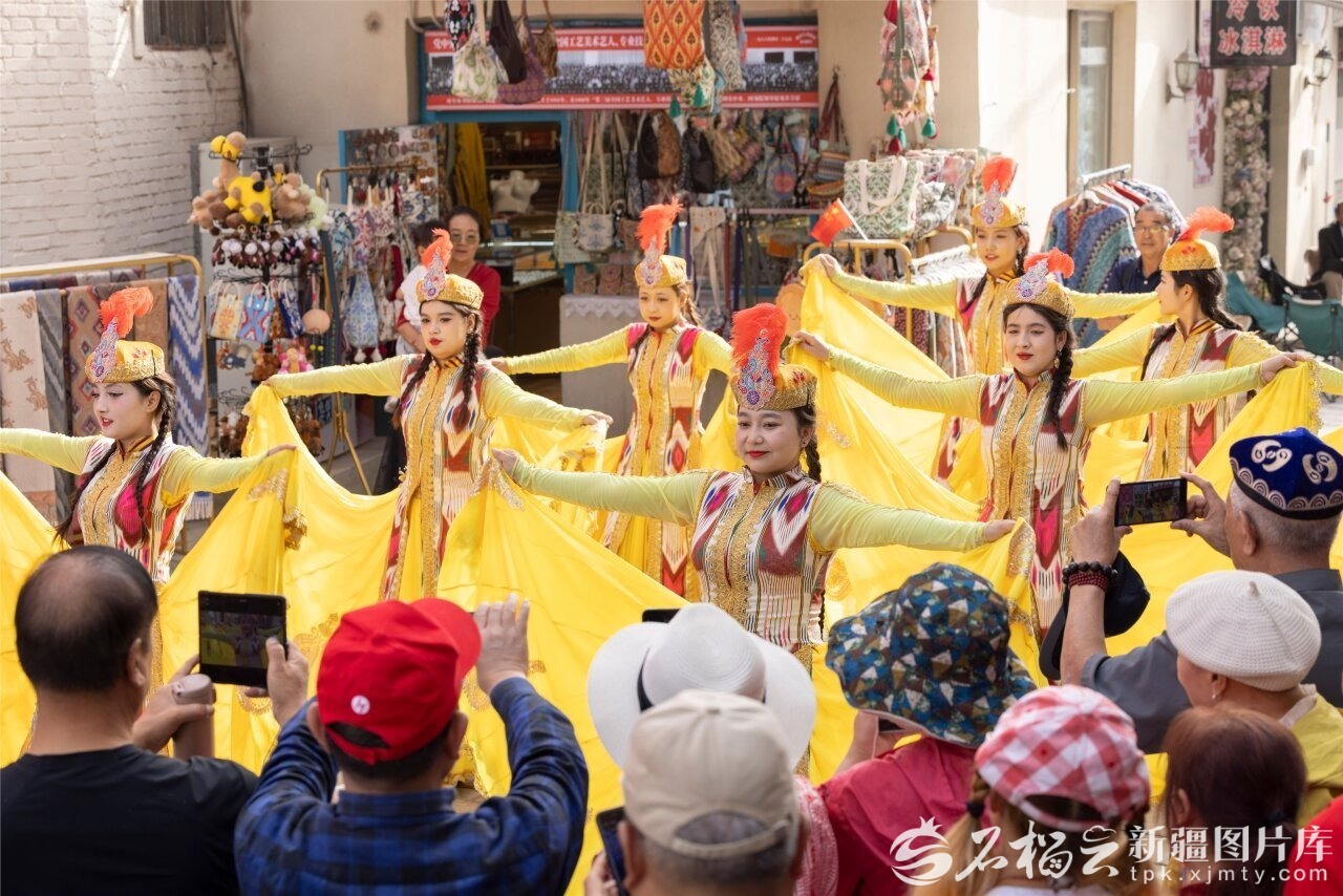 演員在龜茲小巷為游客表演歌舞。袁歡歡攝