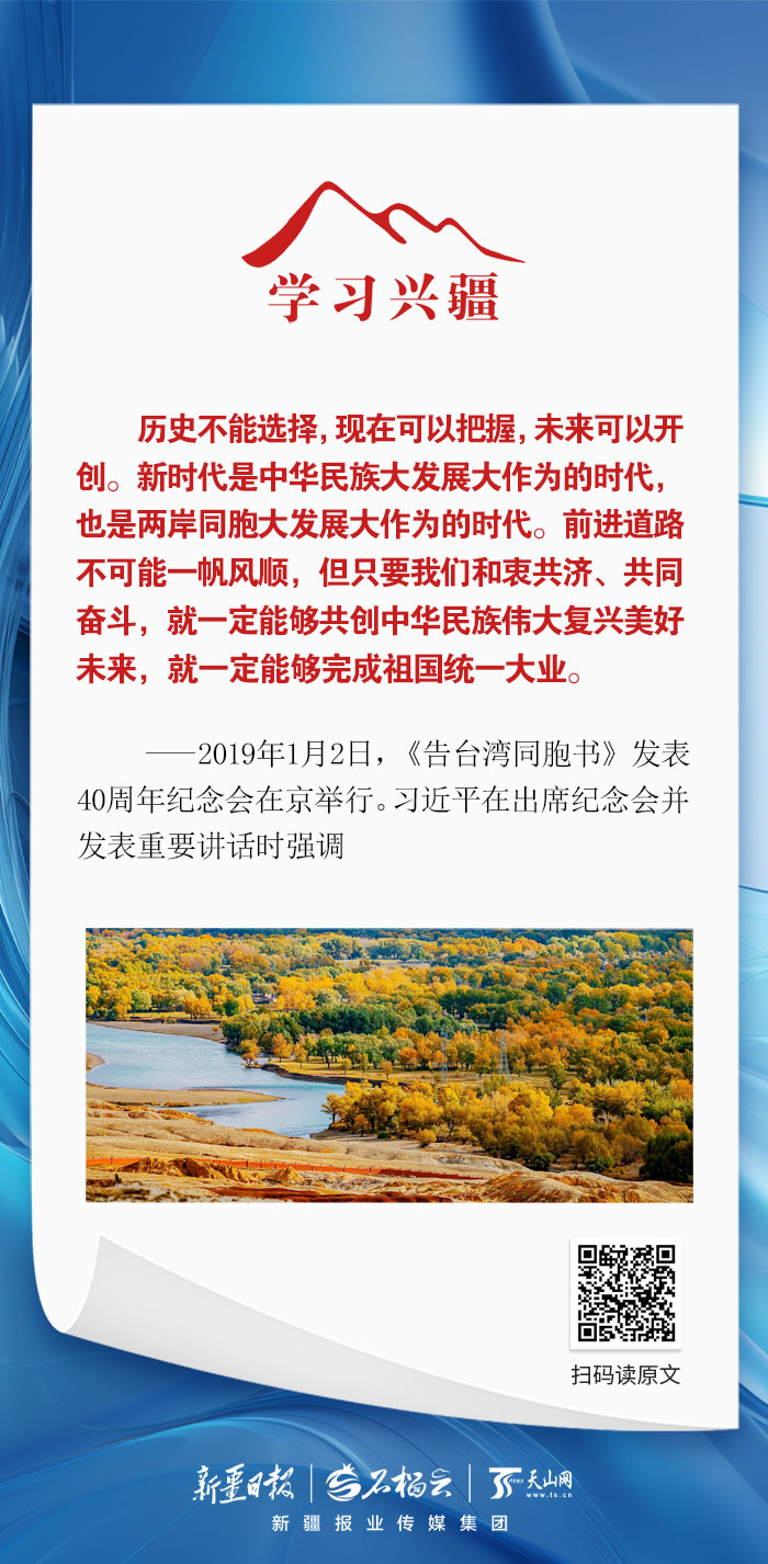 歷史不能選擇,現(xiàn)在可以把握,未來(lái)可以開(kāi)創(chuàng)。新時(shí)代是中華民族大發(fā)展大作為的時(shí)代,也是兩岸同胞大發(fā)展大作為的時(shí)代。前進(jìn)道路不可能一帆風(fēng)順,但只要我們和衷共濟(jì)、共同奮斗,就一定能夠共創(chuàng)中華民族偉大復(fù)興美好未來(lái),就一定能夠完成祖國(guó)統(tǒng)一大業(yè)。