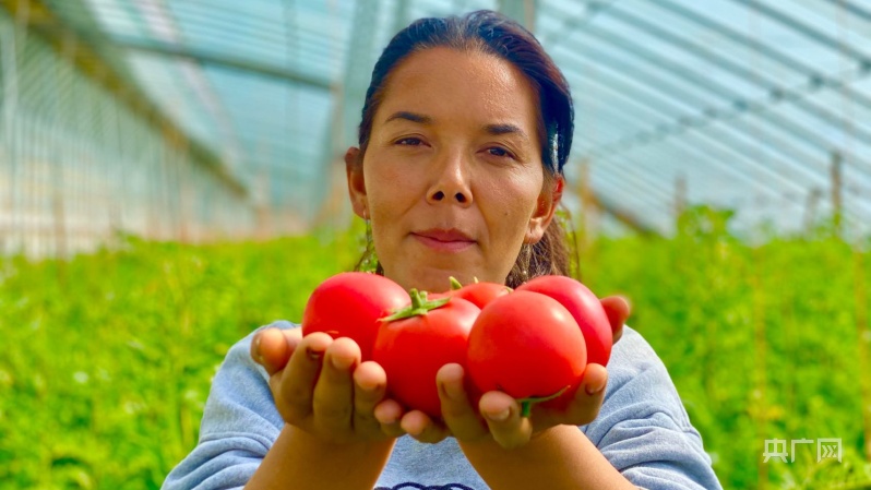 菜農(nóng)手捧著今年豐收的大棚西紅柿(央廣網(wǎng)發(fā) 若羌縣融媒體中心供圖)