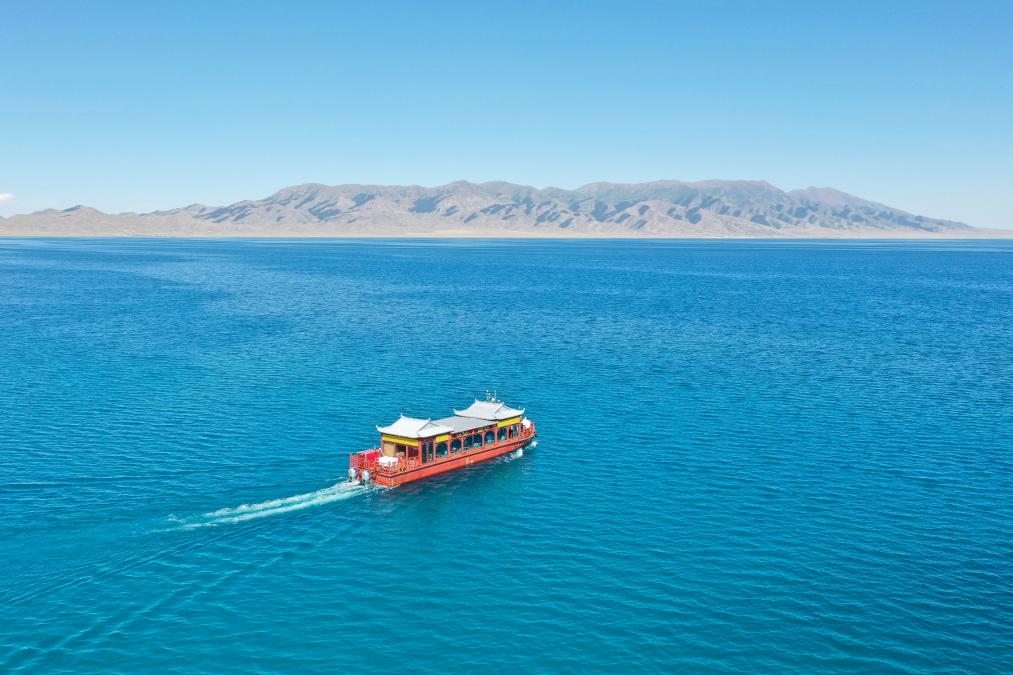 2023年7月25日,游客乘坐游船在新疆賽里木湖游覽(無人機照片)。新華社記者 丁磊 攝