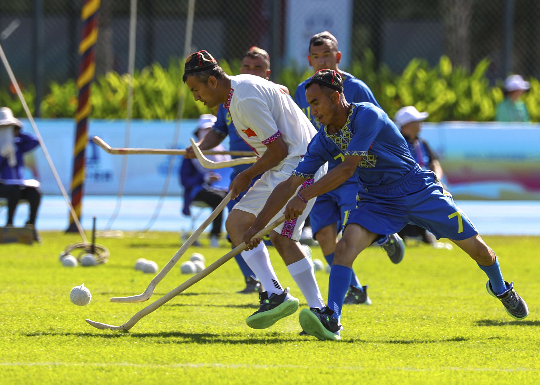 新華社三亞11月25日電(記者孫哲)頭戴維吾爾族花帽的運(yùn)動(dòng)員們靈活穿梭,用手中的木制球桿將棉線纏繞而成的球揮出一道弧線……