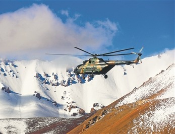 新疆軍區(qū)某陸航旅官兵駕機(jī)巡邏在祖國邊關(guān)。吳世科攝