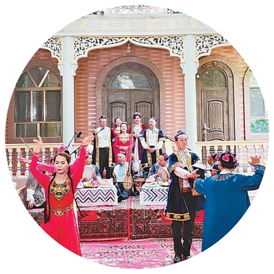 其中的吐魯番木卡姆節(jié)奏歡快、內(nèi)容豐富,唱詞多隨民歌、詩歌而來,是多年來人們對生活經(jīng)驗、文學藝術等的積累?!巴卖敺究窡o鼓不歌、無舞不樂的藝術特色是古代高昌及高昌回鶻汗國的音樂遺風,而魯克沁鎮(zhèn)正是吐魯番木卡姆的重要發(fā)源地?!币懒Αつ竞腺I提介紹。