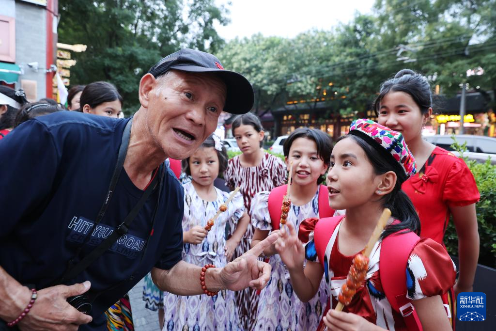 7月28日,在北京街頭,帕提曼罕·排日海提跟一名北京市民學說老北京方言。新華社發(fā)(張利民 攝)