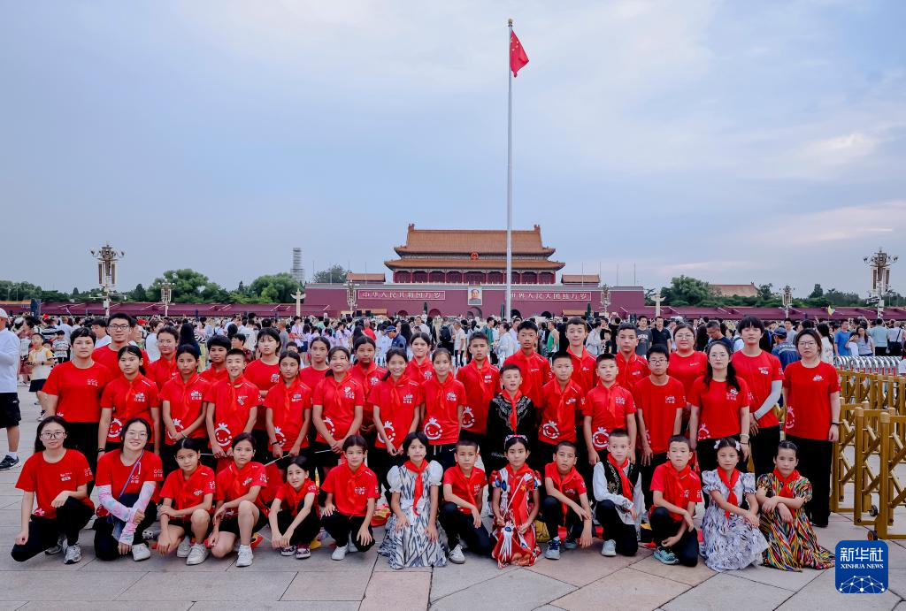 7月31日,帕提曼罕·排日海提(前右六)和參加夏令營的小伙伴及帶隊老師在天安門廣場觀看升旗儀式后合影留念。新華社發(fā)(張利民 攝)