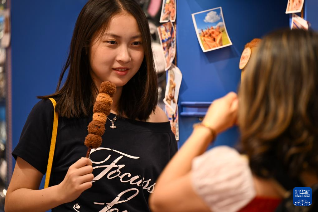 8月21日,在烏魯木齊大巴扎步行街,游客手持文創(chuàng)產(chǎn)品拍照留影。新華社記者 王菲 攝