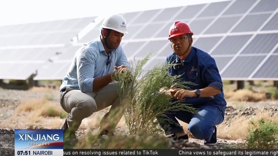外籍主持人林肯探訪了全球最大的“草光互補(bǔ)”光伏基地——阿合雅光伏產(chǎn)業(yè)園。這片由181萬塊光伏板組成的藍(lán)色海洋,占地493公頃,相當(dāng)于700個標(biāo)準(zhǔn)足球場。不僅能夠提供滿足約43萬人全年用電需求,還兼具治沙功效。中國華能集團(tuán)烏什光伏電站負(fù)責(zé)人周博表示,這類光伏設(shè)施能夠穩(wěn)固土壤、防止侵蝕,板面凝結(jié)的水珠還可灌溉下方土地,支持植物持續(xù)生長?!案瓯谄孥E”的背后,是國家實現(xiàn)“雙碳”目標(biāo)而推動的生態(tài)與能源的“雙向奔赴”。