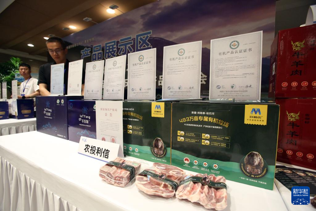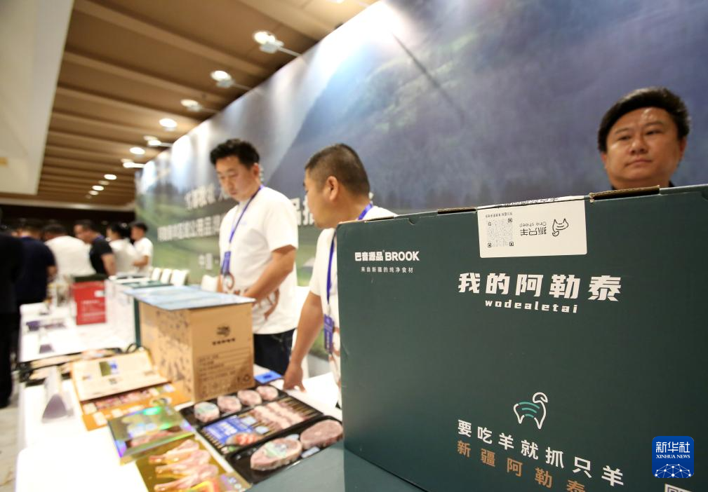 9月20日,工作人員在產(chǎn)品推介會(huì)上展示阿勒泰羊肉商品。新華社記者 程麗 攝