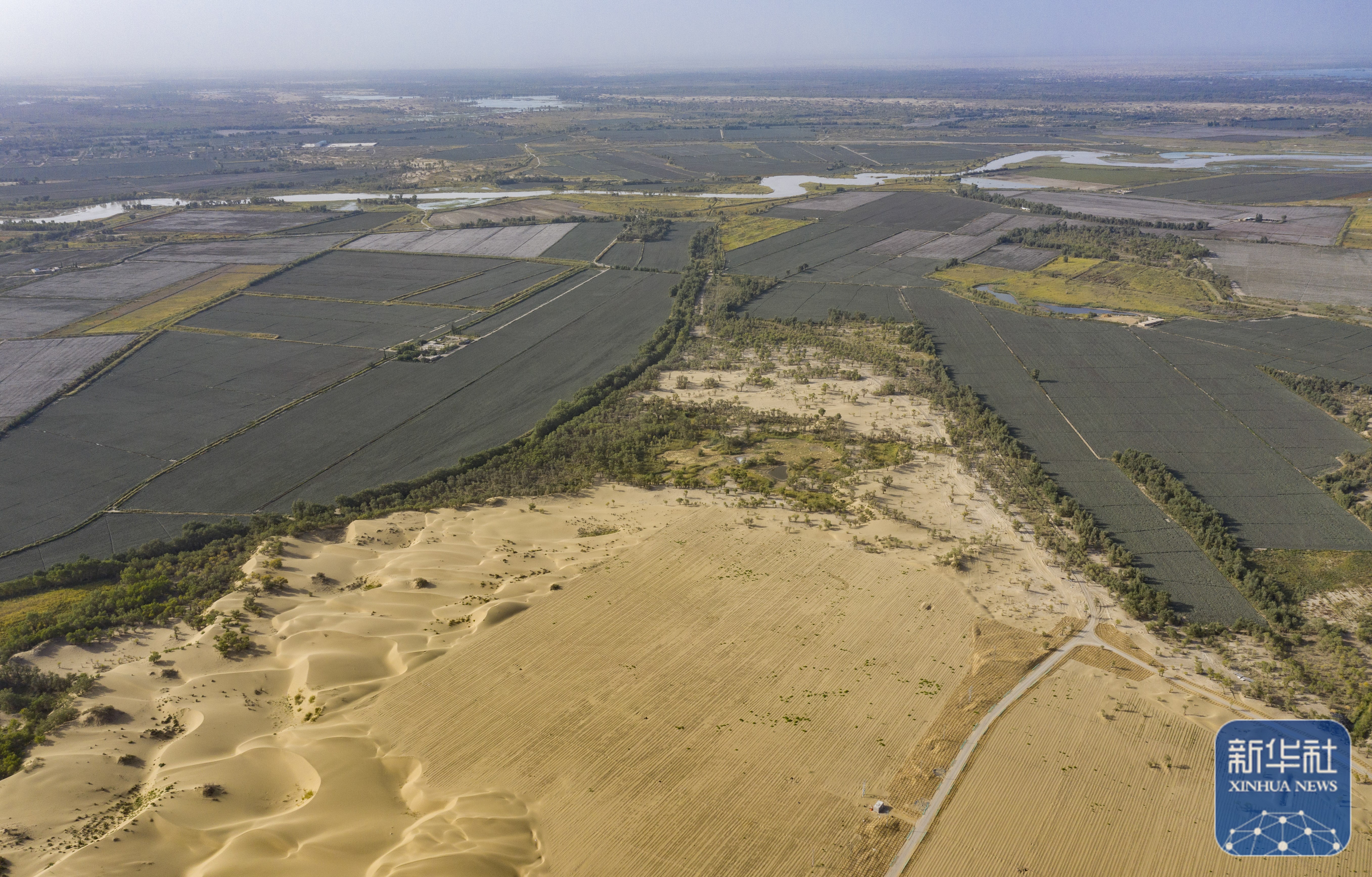 ↑ 在新疆尉犁縣境內(nèi)的塔里木河南岸防沙治沙區(qū)拍攝的羅布麻種植區(qū)(右下)、治理之前自然形成的沙丘(左下)、塔里木河及周圍綠洲(上)(無人機(jī)照片,9月20日攝)。新華社記者 陳朔 攝