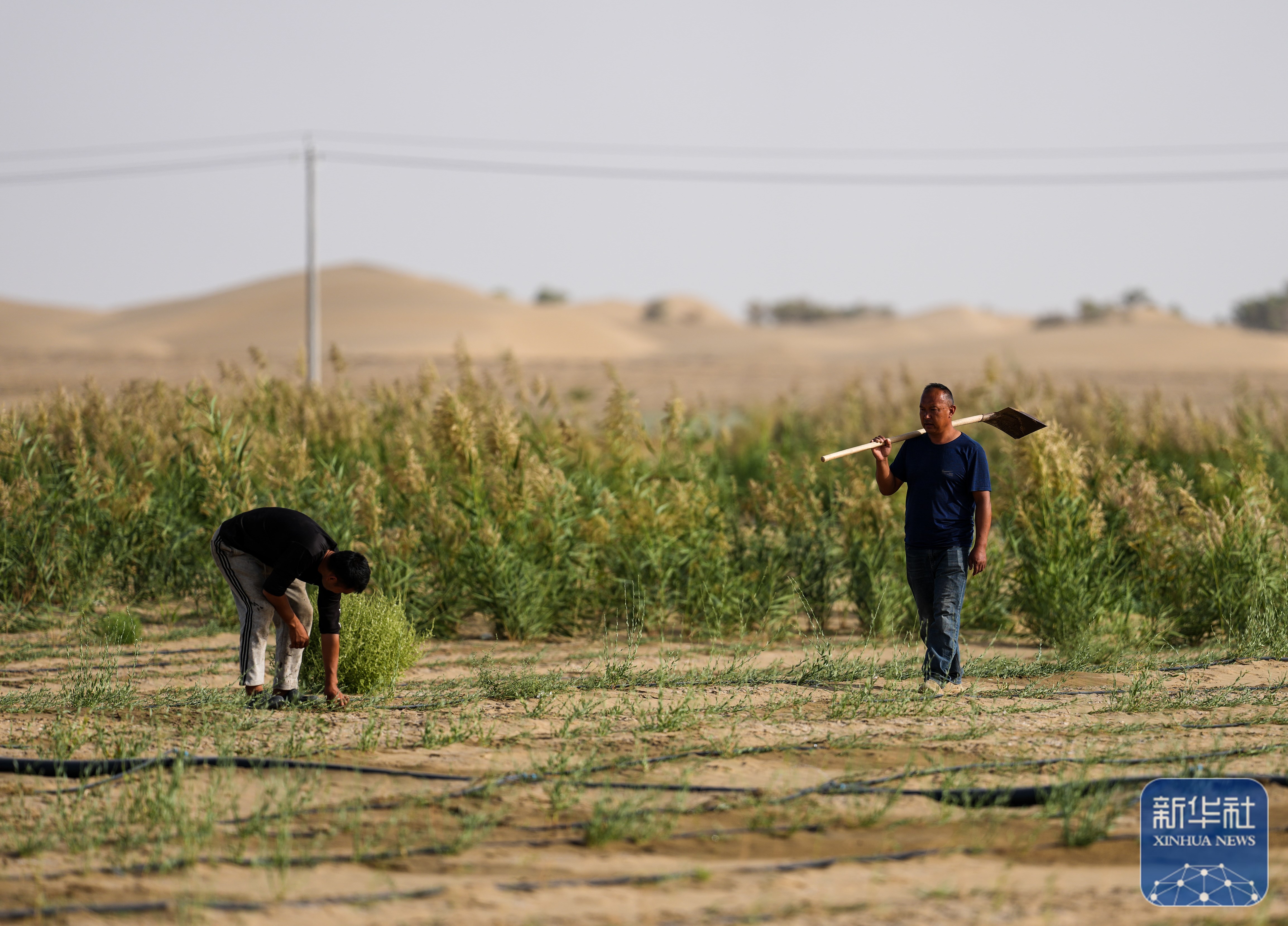 ↑ 9月20日,在新疆尉犁縣境內(nèi)的塔里木河南岸防沙治沙區(qū),工作人員查看滴灌管情況。新華社記者 江文耀 攝