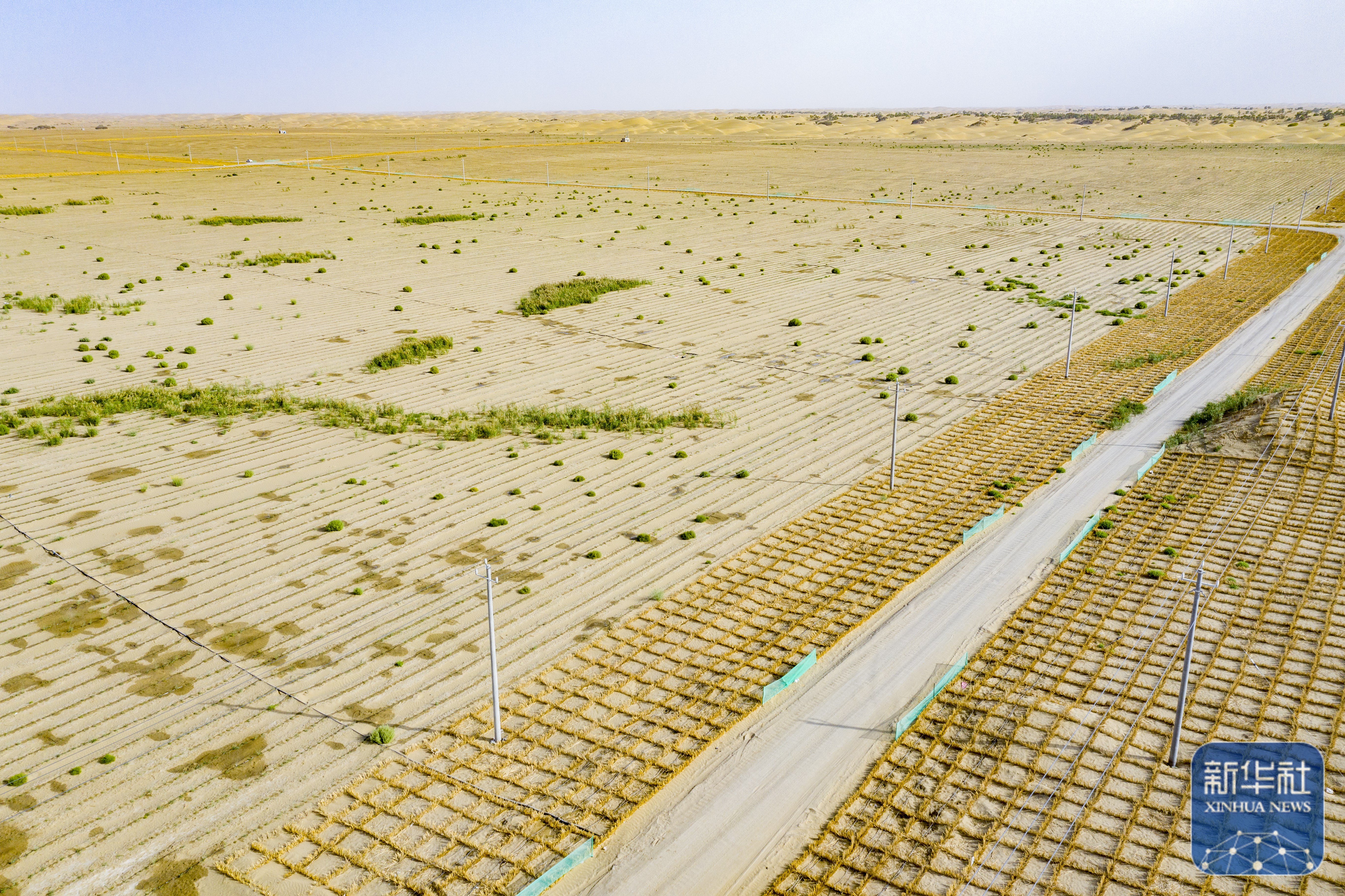 ↑ 5月22日,在新疆尉犁縣境內(nèi)的塔里木河南岸防沙治沙區(qū),大型機(jī)械在平整沙丘(無人機(jī)照片)。新華社發(fā)(汪志鵬 攝)