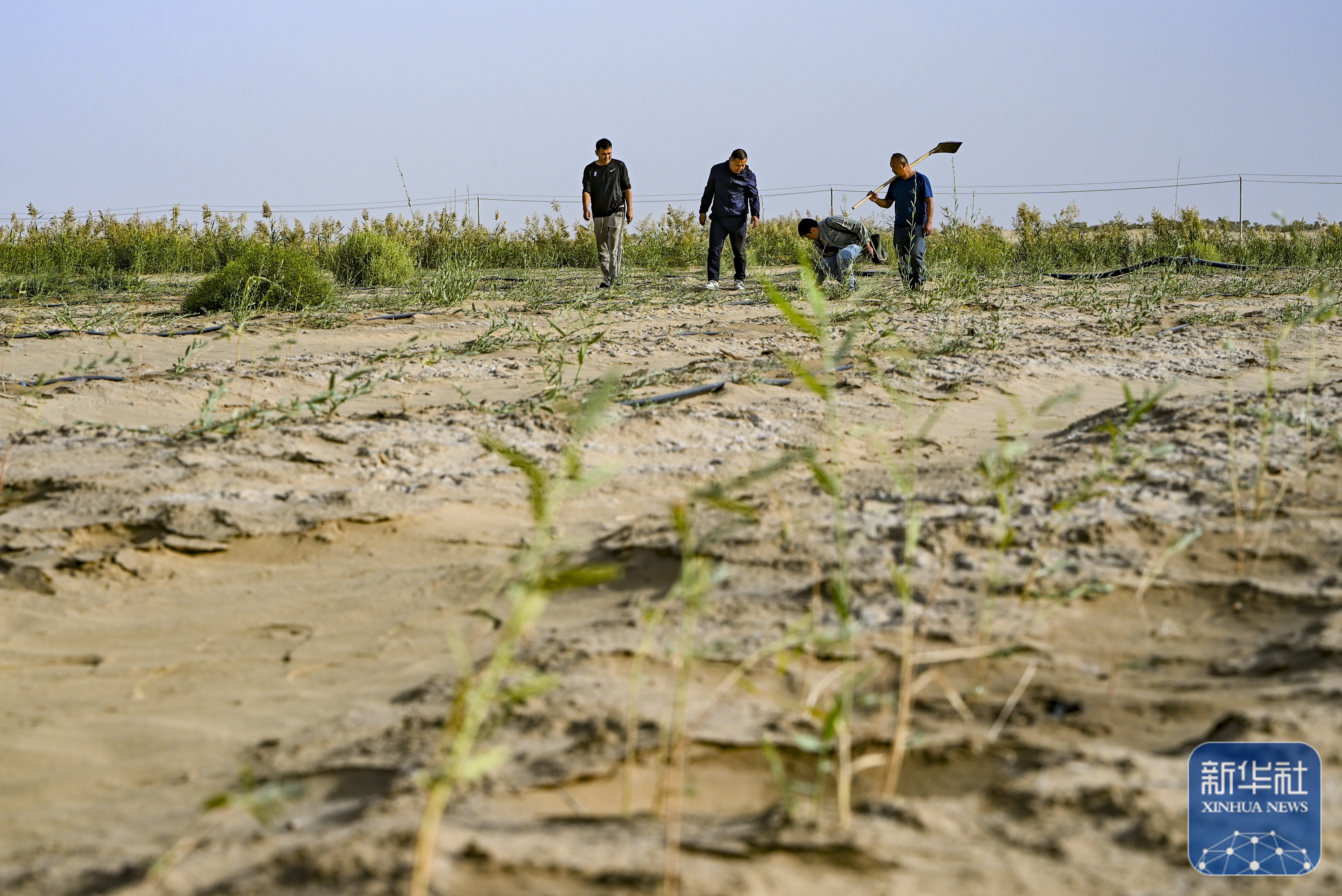↑ 9月20日,新疆尉犁縣國有林管理局護(hù)林員艾力·尼亞孜(左二)和工作人員一起查看羅布麻長(zhǎng)勢(shì)。新華社記者 陳朔 攝