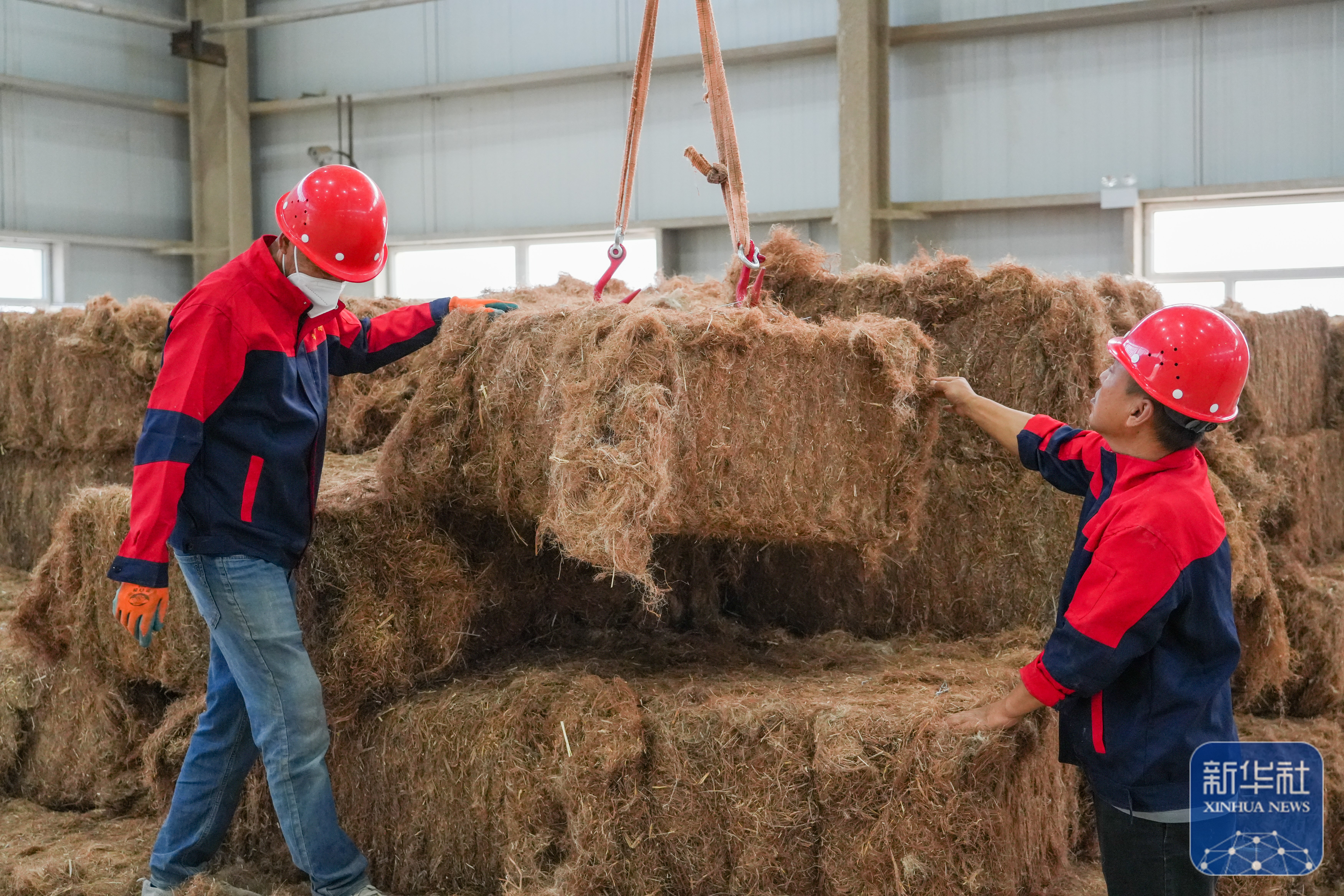 ↑ 9月20日,在新疆尉犁一家服裝公司的羅布麻纖維脫膠車間,工人吊送原材料。新華社發(fā)(汪志鵬 攝)