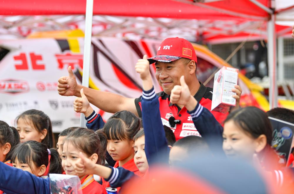 2023年5月,北京汽車車隊領航員陳峰在環(huán)塔營地與當?shù)匦W生們合影。新華社記者 胡虎虎 攝
