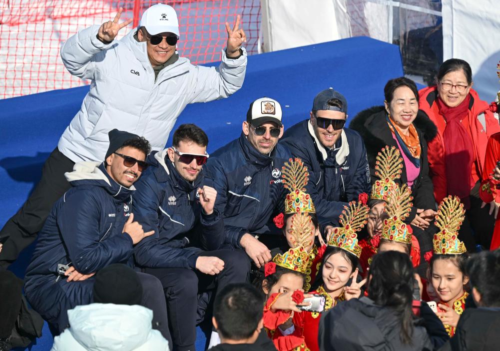 2025年2月,參加中國國際雪地排球邀請賽的法國選手與文藝表演者合影。新華社記者 胡虎虎 攝
