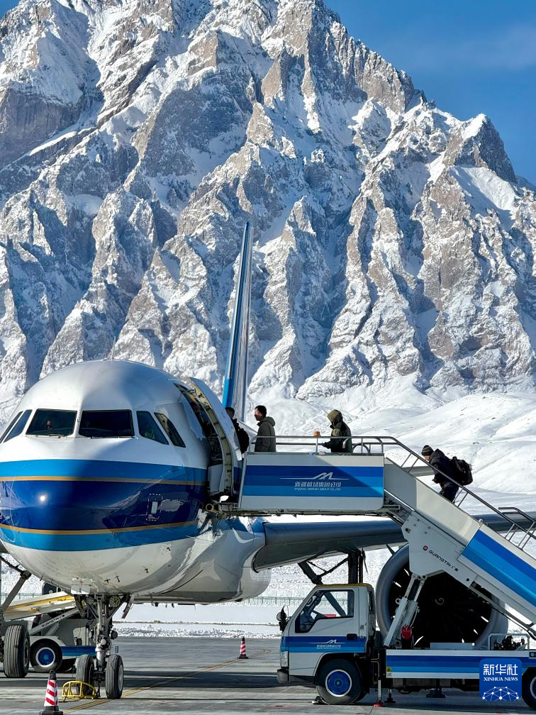 1月13日,旅客在塔什庫爾干紅其拉甫機場準備登機。新華社記者 陳朔 攝