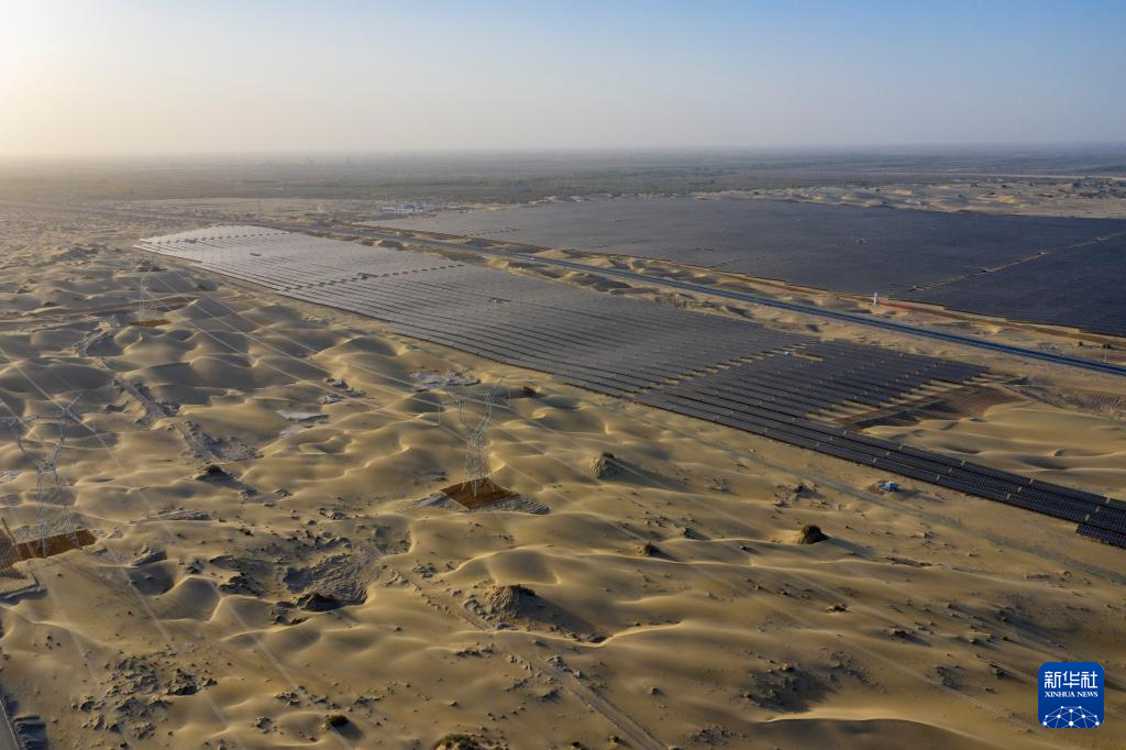 9月22日在新疆巴音郭楞蒙古自治州若羌縣拍攝的中國綠發(fā)新疆中綠電若羌400萬千瓦光伏項(xiàng)目(無人機(jī)照片)。該項(xiàng)目每年可發(fā)電69.08億千瓦時(shí),滿足南疆200萬戶家庭用電需求。新華社記者 陳朔 攝