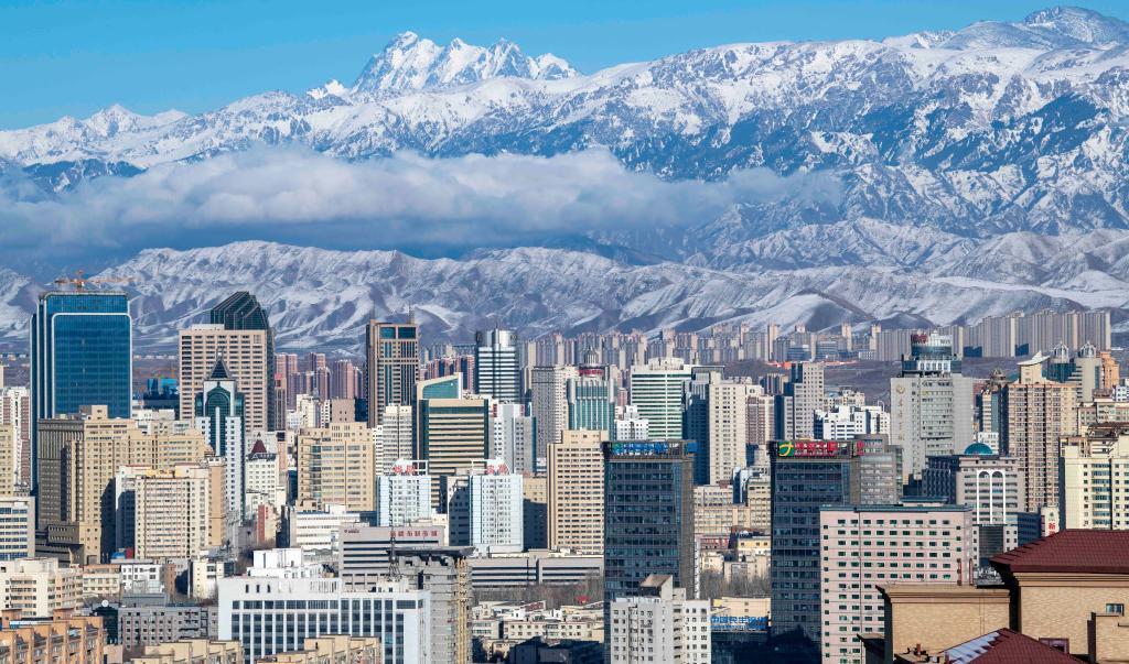 天山腳下的烏魯木齊市城區(qū)一角(2022年3月30日攝)。