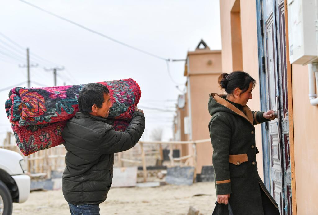 依明·買提庫爾班(前)和妻子抬著行李跨出老家的籬笆墻,準備乘車前往安置點(2019年11月17日攝)。
