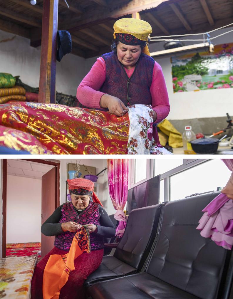 拼版照片:上圖為都熱·加爾曼的妻子那尼克·苦卡尼在山谷舊居中縫制搬遷后需要使用的新被子(2018年11月13日攝);下圖為那尼克·苦卡尼在愛民村的新家中制作手工刺繡(2020年6月3日攝)。
