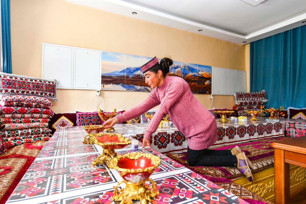 新疆塔什庫爾干塔吉克自治縣塔什庫爾干鄉(xiāng)瓦爾希迭村村民瑪依努爾古麗·依克木在民宿內(nèi)擺放物品,準備招待游客(2020年6月4日攝)。