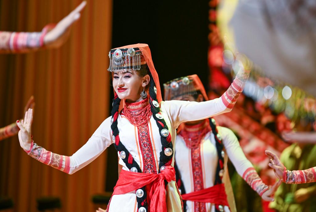 在新疆塔縣蔥嶺演藝中心,青年舞蹈演員阿曼古麗·瓦比克參與音樂劇《拉齊尼·巴依卡》的演出(2025年3月22日攝)。