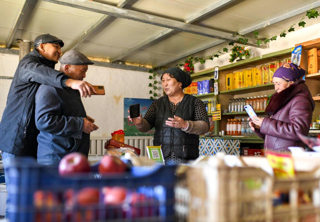 周邊牧民來到家中買東西,巴哈提(右二)向顧客展示收款到賬界面,和大伙兒聊天(2023年2月15日攝)。