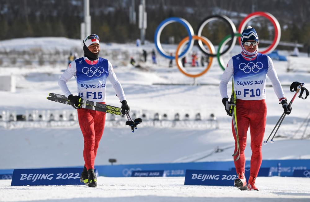 北京2022年冬奧會越野滑雪女子10公里(傳統(tǒng)技術(shù))比賽開賽前,試滑員吐爾松江·布爾力克(左)和隊友哈那提·吐爾遜離開比賽場地(2022年2月10日攝)。兩人都來自新疆北部牧區(qū)溫泉縣。