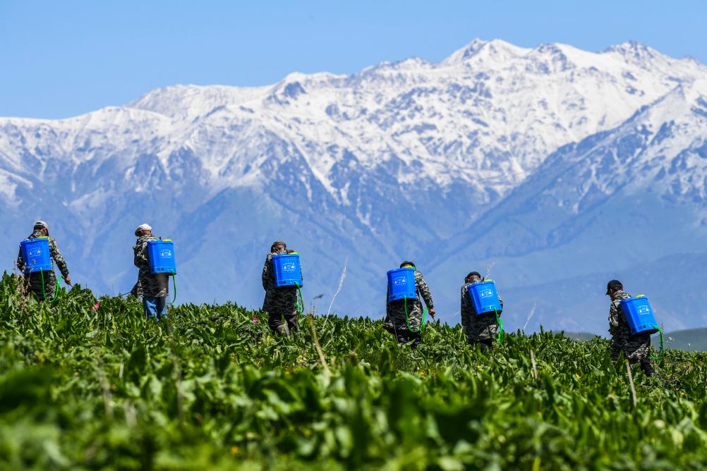 新疆新源縣別斯托別鄉(xiāng)恰普河加嘠村村民在那拉提草原深處噴灑除毒害草藥劑(2018年5月26日攝)。